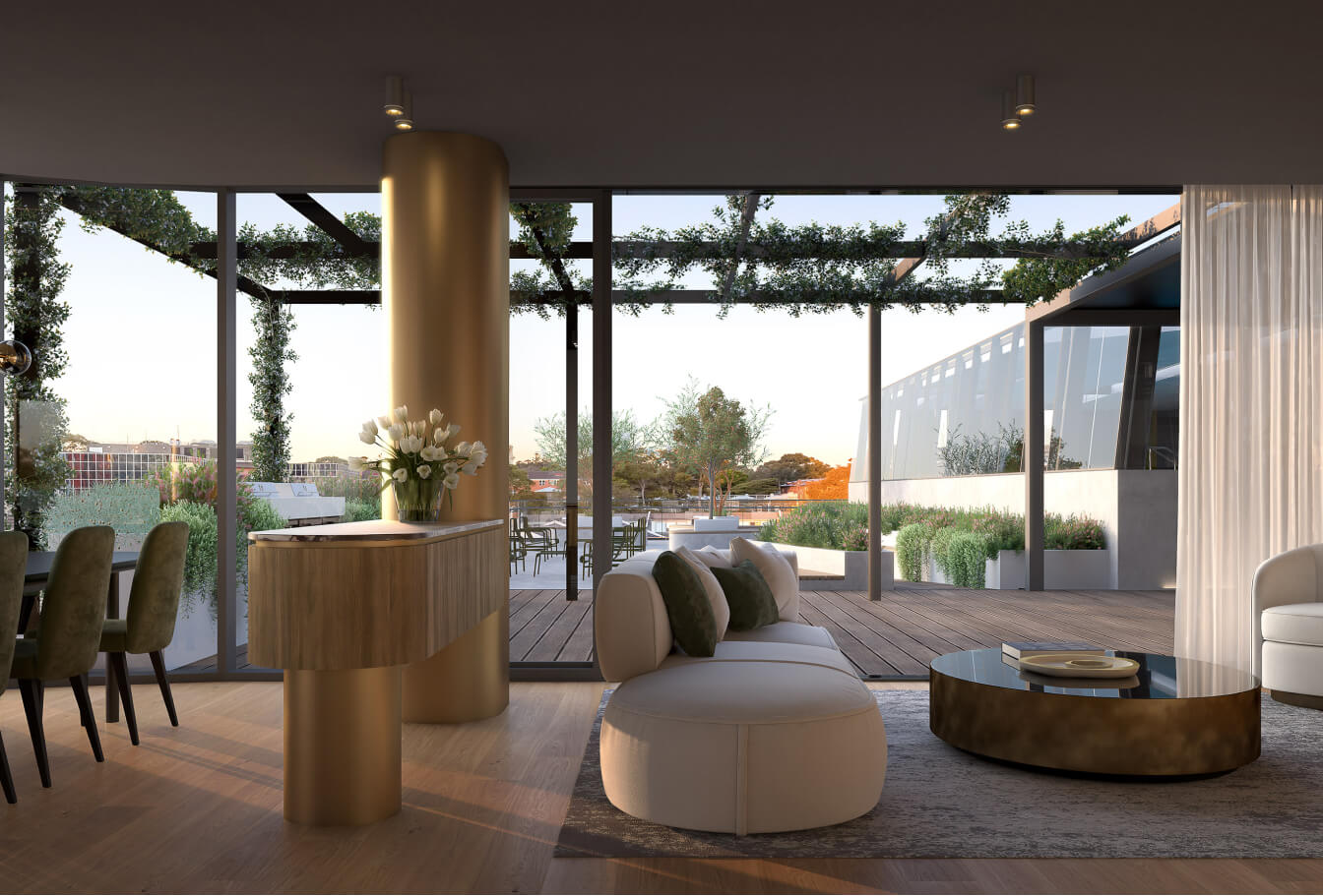 Natural stone accents and expansive views of Melbourne create a seamless blend of elegance and functionality. Exclusive features and meticulous craftsmanship ensure an unparalleled living experience.
